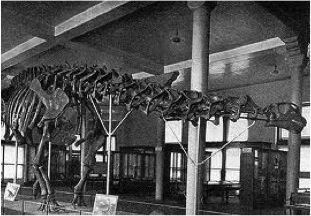 The lumbar vertebras have their centra constricted, and also contain large cavities. The caudals are nearly or quite solid. The chevrons have their articular heads separate. The sacrum of this animal is, approximately, 50 inches (l-27m) in length. The last sacral vertebra is 292°TM in length, and 330mm in transverse diameter across the articular face. A detailed description of these remains will be given in a subsequent communication. They are from the Atlantosaurus beds of Wyoming. The animal was probably seventy or eighty feet in length.” [4]
