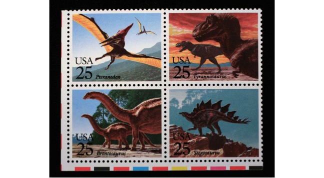 While on the surface this presents an issue of taxonomic accuracy, which I will discuss below, the underlying problem concerning accuracy doesn’t become a major issue until a century later in October 1989. In that year, and as a promotional ‘tie-in’ with the video cassette release of Universal Picture’s The Land Before Time, the United States Postal Service released four ‘dinosaur stamps’ with the images of a Pteranadon, Tyrannosaurus Rex, Brontosaurus, and Stegosaurus.